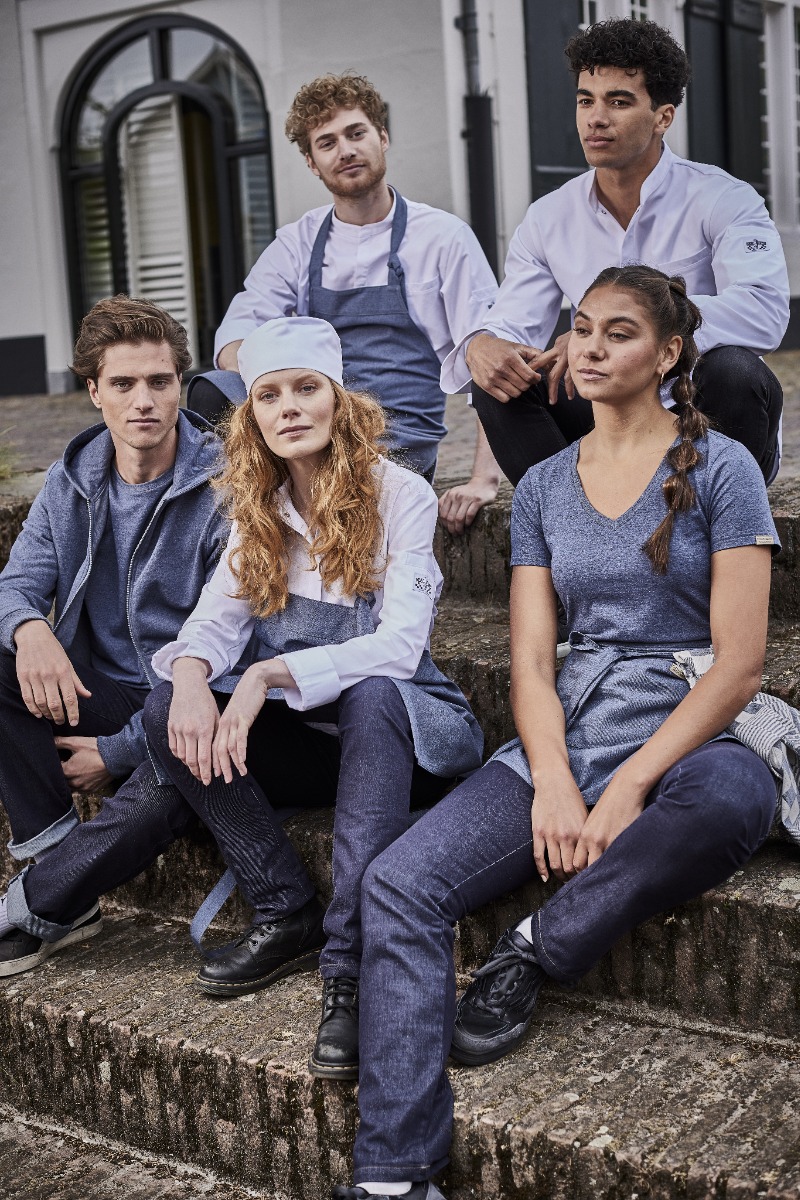 Een veelzijdige en circulaire collectie bestaande uit onder andere een witte koksbuis, schorten, sloven en t-shirts in een mooie blauw/grijze kleur met de naam blue melêe.